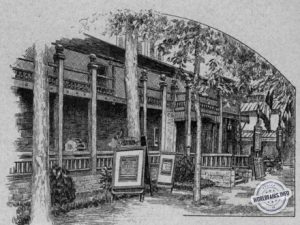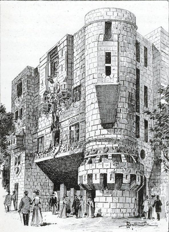 LE MANOIR A L’ENVERS C’est un vieux castel gothique fiché en terre par ses cheminées et sa toiture et dressant en l’air ses fondations C’est le Manoir à l’envers où par un jeu de glaces ingénieusement combiné tout paraît sens dessus dessous. Vous vous figurez marcher au plafond et avoir les meubles au-dessous de vous. Si vous regardez par les fenêtres, vous verrez l’Exposition à l’envers…