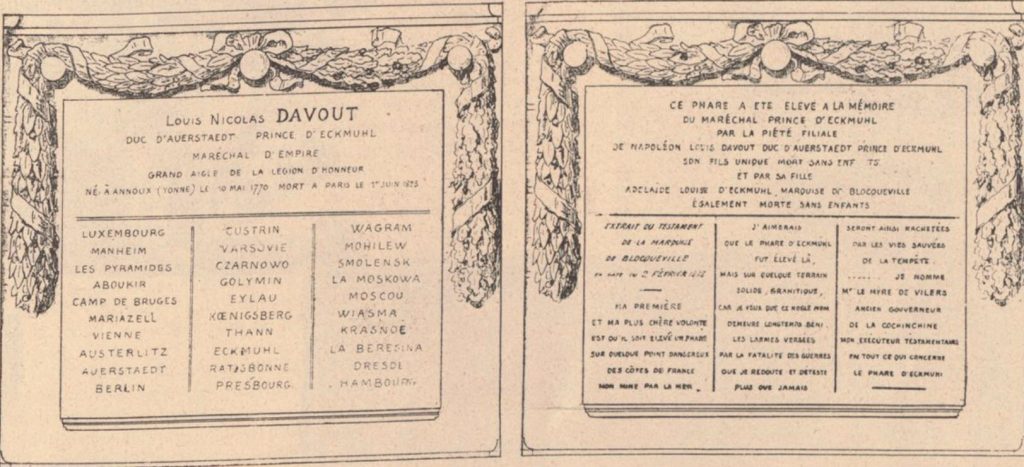 Le nom du phare est attribué au général Davout, duc d’Eckmühl, prince d’Eckmühl père de la matquise de Blocqueville qui dans son testament a consacré la somme de 300 000 Frs pour la construction d’un phare.