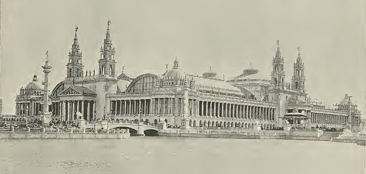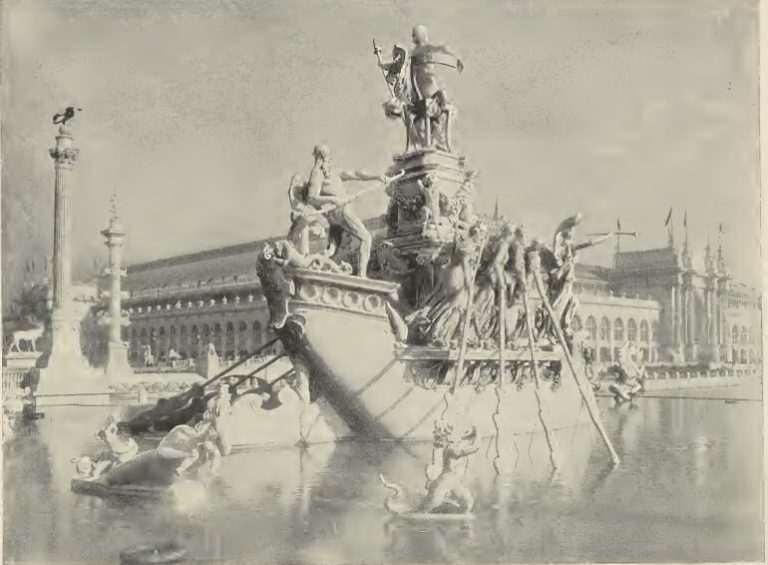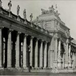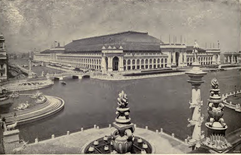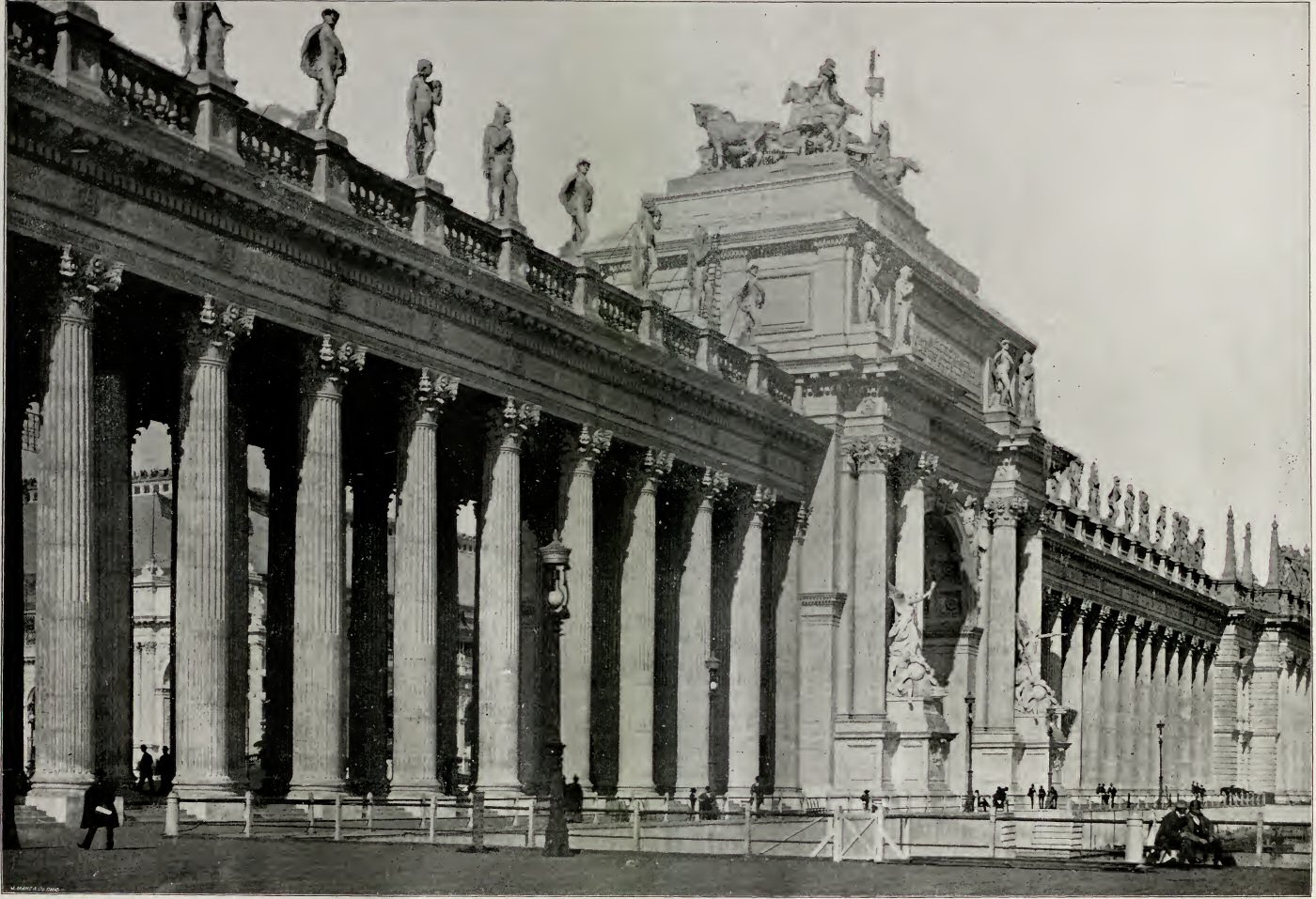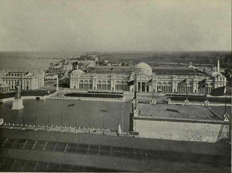 Et côté lac de la cour d’honneur, le spectacle devait marquer à vie chaque visteur: à droite l’immense bâtiment d’arts manufacturés et Libéraux, ensuite le bâtiment de l’électricité. A gauche le bâtiment de l’agriculture suivi de la galerie des machines. En face faisant face à la statue de la République devant le Péristyle, le magnifique bâtiment administratif.