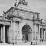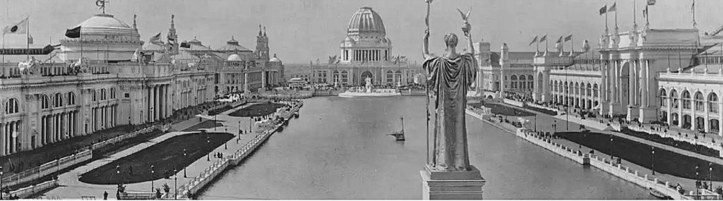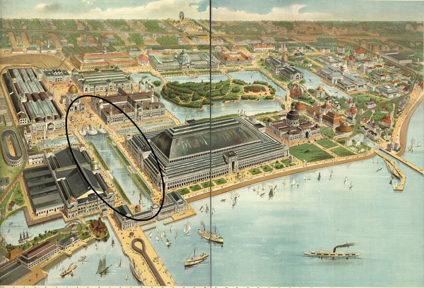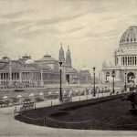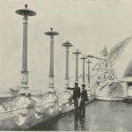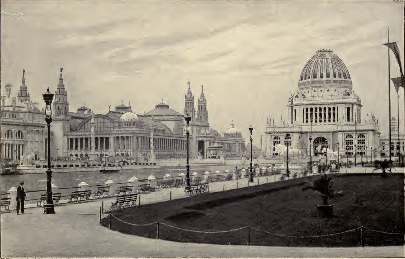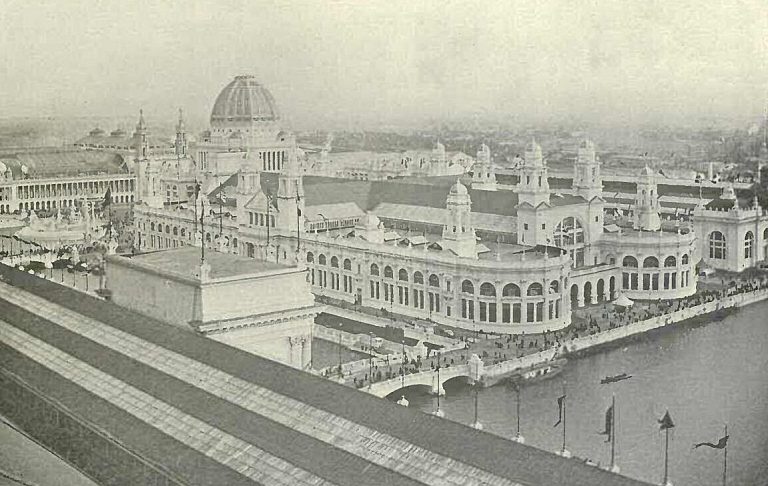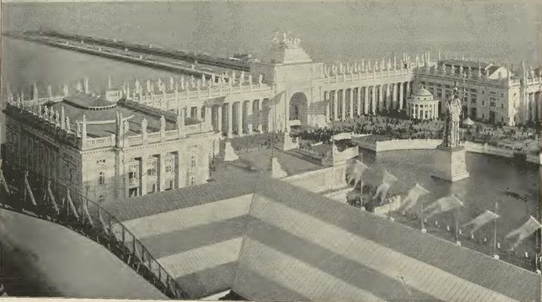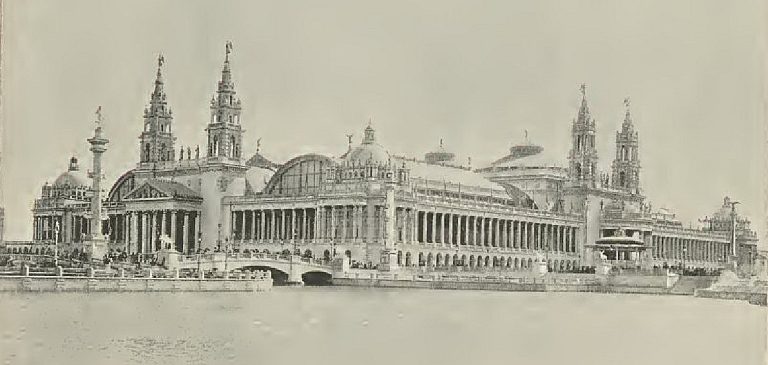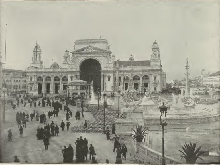 Et côté lac de la cour d’honneur, le spectacle devait marquer à vie chaque visteur: à droite l’immense bâtiment d’arts manufacturés et Libéraux, ensuite le bâtiment de l’électricité. A gauche le bâtiment de l’agriculture suivi de la galerie des machines. En face faisant face à la statue de la République devant le Péristyle, le magnifique bâtiment administratif.