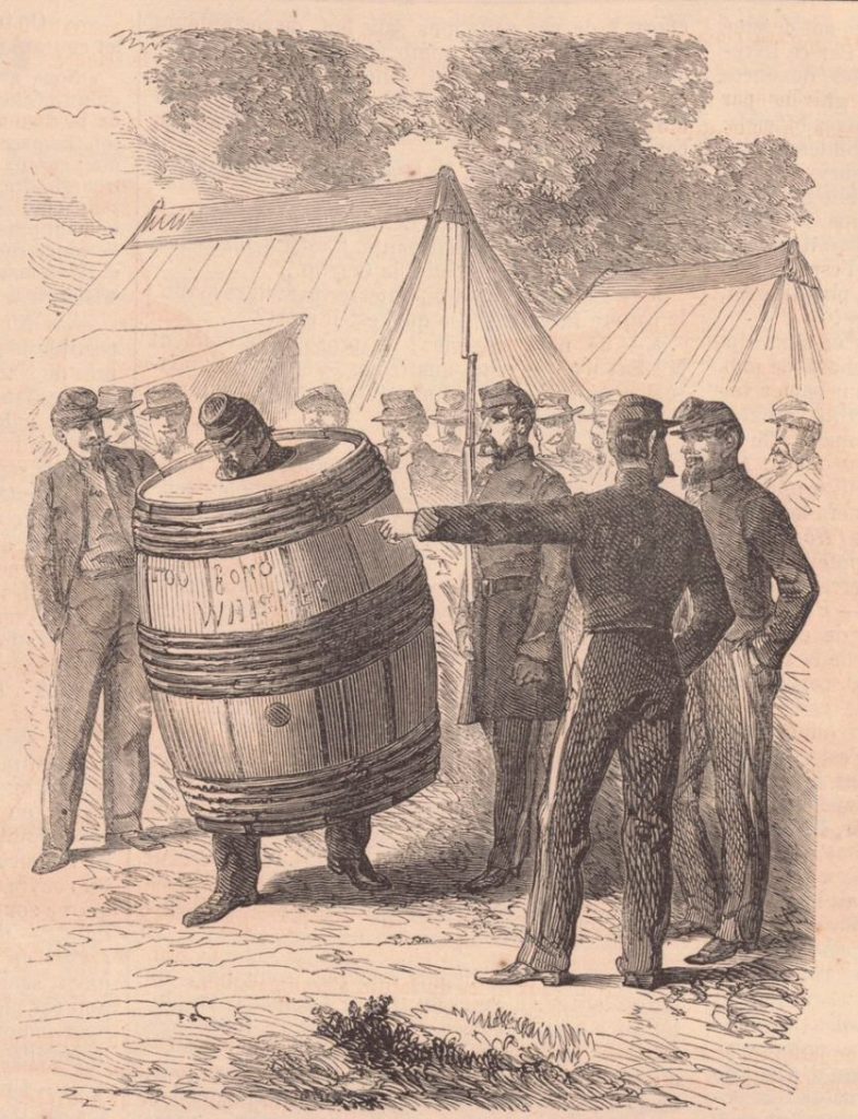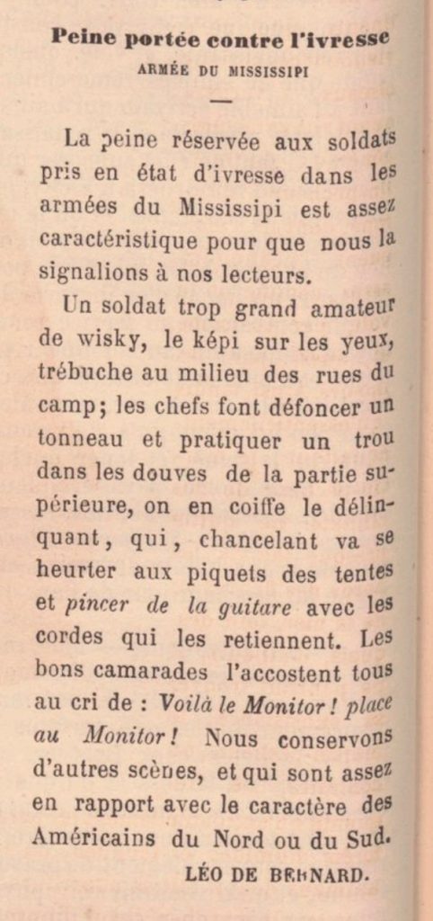 Guerre de Sécession 1861-1865. Punition aux soldats en état d’ivresse. Laisser un commentaire / Par Gilwro / 15 janvier 2025 Dans les armées du Mississipi les soldats pris en état d’ivresse se voyait enfermé dans un tonneau laissant apparaître la tête et les jambes.Situation peu commode pour le puni chancelant mais comique pour les autres militaires.