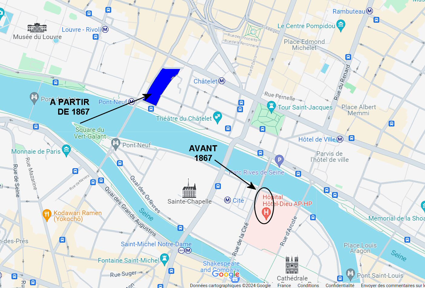 Malheureusement on était dans la période du nouveau Paris du Baron Haussmann et en 1866, la ville ordonna l’expropriation pour construire le nouvel Hôtel Dieu.
