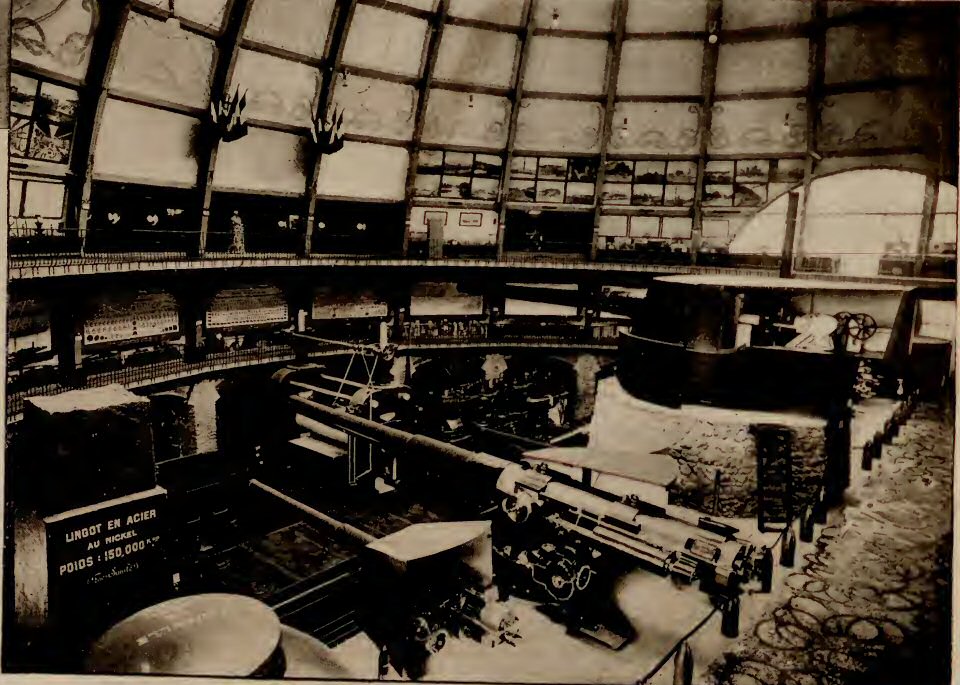 En abordant le jardin du Champ de Mars par la porte de l’Université, et prenant l’avenue dite de Bourgogne qui commence à cette porte, on rencontre immédiatement sur la gauche un édifice d’heureuse construction, où est inscrit le nom de Creusot. Cette usine est si importante, qu’elle a dû, comme quelques-unes de ses rivales ouvrir une exposition dans l’Exposition même. Si nous jetons un coup d’oeil autour de l’édifice, nous y lisons les inscriptions suivantes :