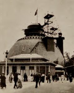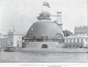L’immense dôme faisait 43m de diamètre et était surmonté d’un campanile de 12m de diamètre. Des canons de différentes tailles rappellent la fortification d’un fort cuirassé.