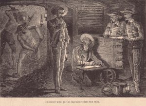 Sous la terre où nous marchons, sous cette ville de travail où nous sommes, il y en a une autre non moins active, mais sombre comme la nuit. On y descend par 10 puits différents. Il ont 200 mètres environ de profondeur, et on le creuse de plus en plus. Tout le long du puits on rencontre des galeries sur lesquelles il donne accès. Cette ville souterraine renferme des rues, des places, des rails où roulent des chariots de charbon que les mineurs ont arraché à coups de pic et de pioche. C’est ce charbon qui alimentera les grands fourneaux que tu as vus, c’est lui qui mettra en mouvement ces machines qui sifflent, tournent et travaillent sans repos. Puis, quand à l’aide de ce charbon on aura fabriqué toutes les choses que tu as vues, on les expédiera par le canal du Centre sur tous les points de la France ».