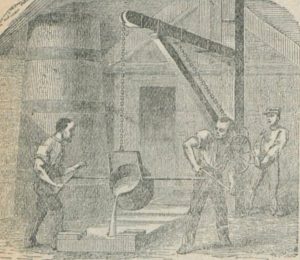 espèces de tours qu’on remplit par le haut de minerai de fer. Une fois que le haut fourneau est allumé, on le remplit jour et nuit sans interruption pour avoir la plus grande chaleur possible, jusqu’à ce que les murs usés se fendent et éclatent A mesure que le fer se fond, il tombe en dessous, dans un réservoir.