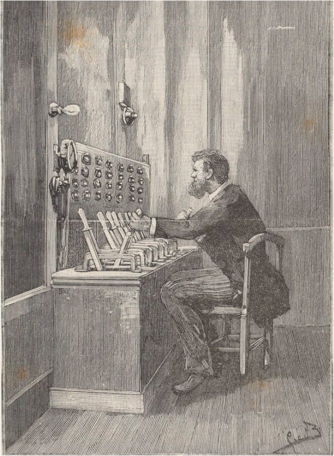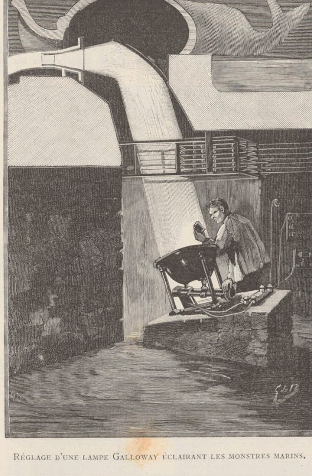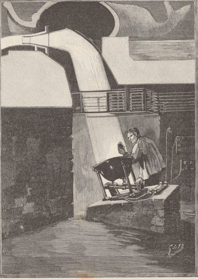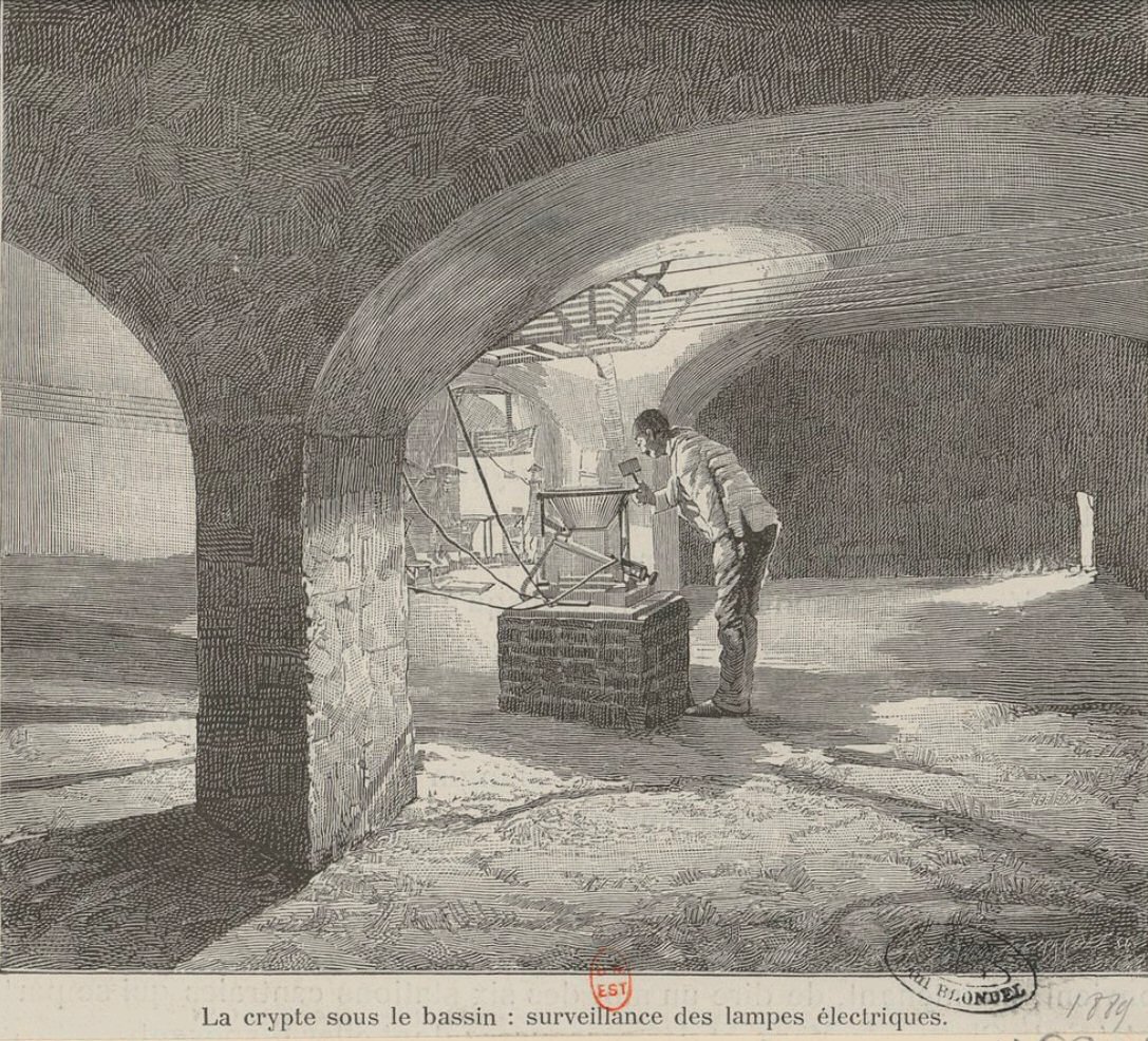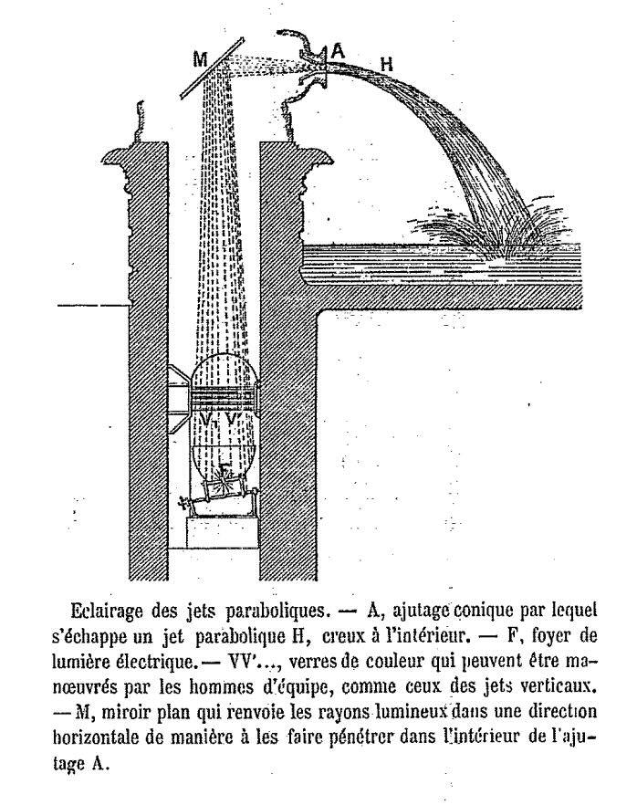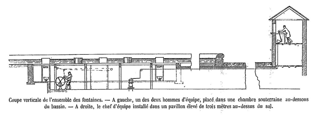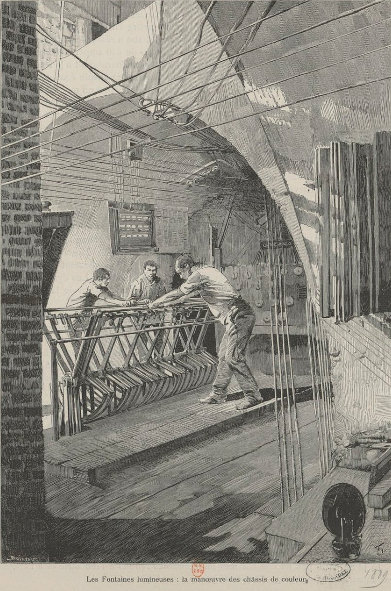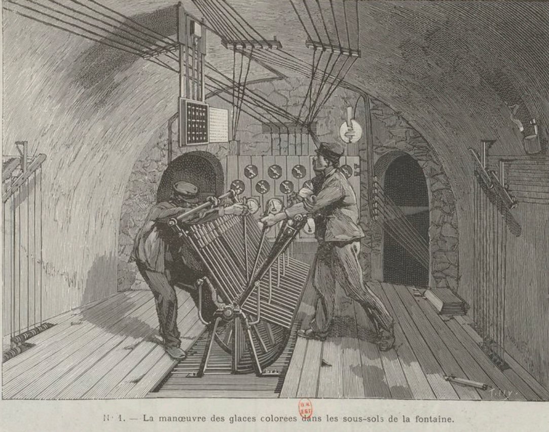 « Les hommes de manœuvre, au commandement de leur chef d’équipe, disposent les leviers suivant les indications d’un tableau placé devant leurs yeux où viennent s’inscrire électriquement les ordres de l’opérateur, qui diriga d’un kiosque placé à distance la manœuvre générale. Pour la partie Galloway, les leviers de manœuvre des verres sont dans le sous-sol du bassin octogonal. Mais ceux qui commandent les robinets d’eau sont plaçés dans le kiosque à la portée de l’opérateur qui a devant lui ces leviers et une rangée de boutons électriques au moyen desquels il transmet simultanément les ordres aux deux groupes de leviers de manœuvre des verres de couleurs ».