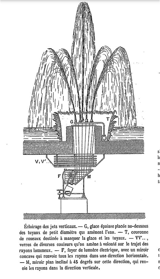 « Dans le bassin, des personnages jouent dans des poses agitées, avec des tritons, qui projettent des torrents d’eau. Tout cet ensemble est d’un grand effet décoratif. Machinée par des procédés nouveaux et jusqu’ici inconnus en France, cette fontaine, éclairée chaque soir à la lumièrc électrique, lance à de grandes hauteurs des jets d’eau colorés qui s’irradient en poussière alternativement rouge, violette, bleue, verte ou jaune. Le coup d’œil est vraiment miraculeux. »