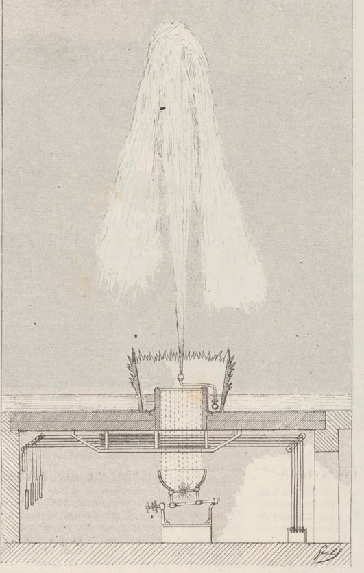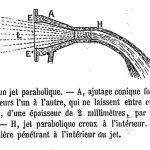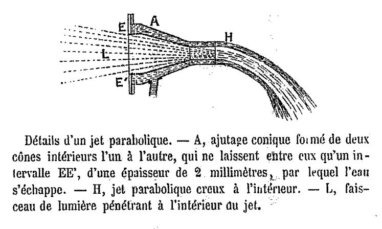 « En 1854, M. Colladon, ingénieur suisse, indiquait dans une note qu’il adressait à l’Acaiémie des sciences de Paris, qu’en plaçant dans une chambre noire un vase muni d’un robinet et d’une lentille convergente convenablement disposée, on pouvait diriger dans le jet des rayons lumineux et que ceux-ci, une fois entrés, n’en sortaient plus, et que, du reste, le jet était d’autant plus lumineux que le liquide employé était plus limpide ».