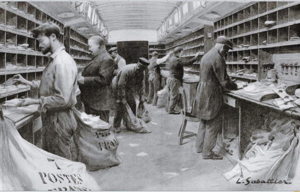 Depuis 1845, le courrier était acheminé et trié dans les wagons de la poste dans des conditions très pénibles. La première ligne fut Paris-Rouen.